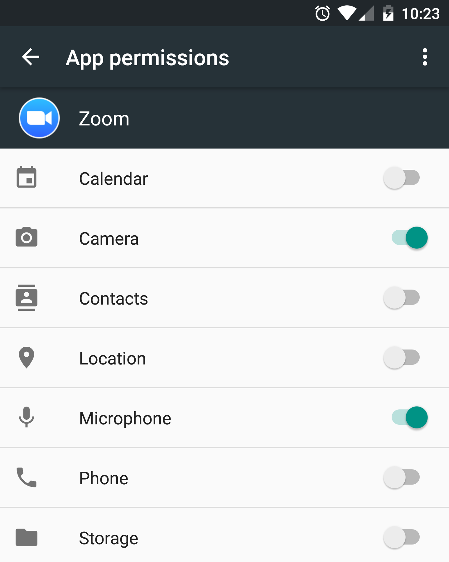 The instructions below use screencaps taken from Android 6.0 (Marshmallow). If your Android version varies widely, it may be fastest for you to uninstall and reinstall Zoom and re-enter the meeting instead, so that you are prompted again to provide permission to access the camera/microphone.