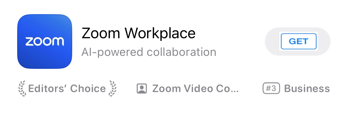 3. If you have not installed Zoom before, use the "Get" button and it will turn into an "Install" button. Tap the "Install" button. (Depending on your security settings, you may be asked to log into your Apple ID account.)