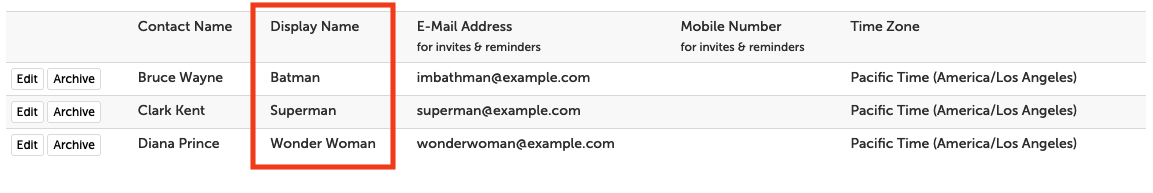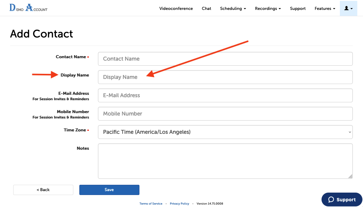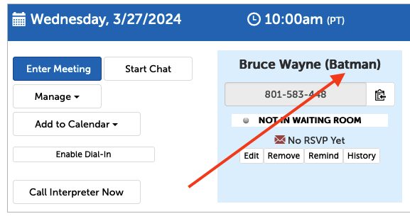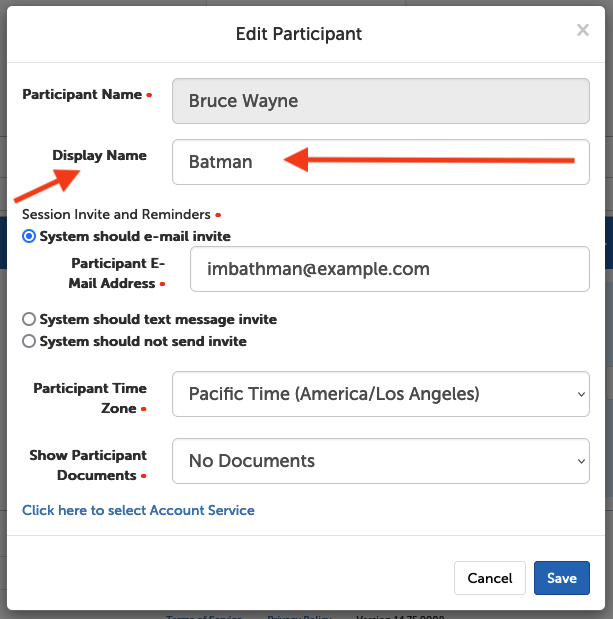 Display Names are useful in group settings where your participants shouldn’t see other participants' names in the group video (or chat) session. By adding this new name field that we’re calling “Display Names”, the system allows accurate contact names to be entered while ensuring that your participants only see the participant name that you choose to display.