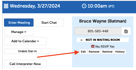 1. To add or change a Display Name on an existing session participant, you can click "Edit" at the bottom of their participant panel.